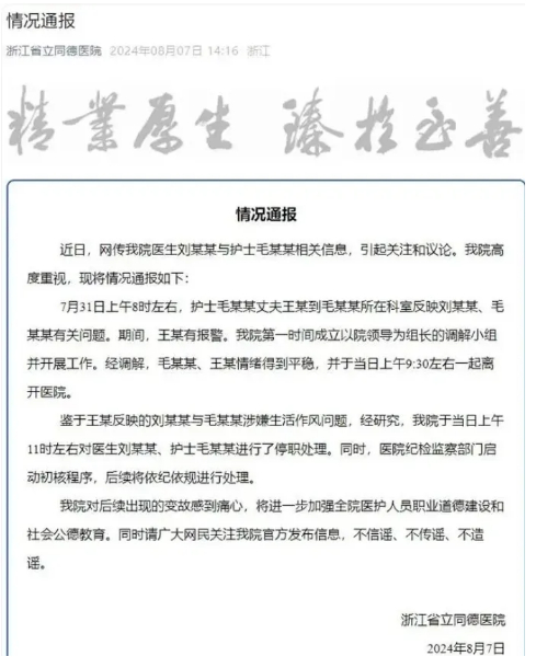 针对此事,8月7日浙江省立同德医院发布情况通报。近日,网传浙江省立同德医院医生刘某与护士毛某相关信息,引起关注和议论。医院高度重视,现将情况通报如下: