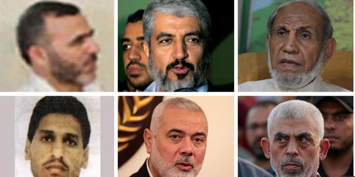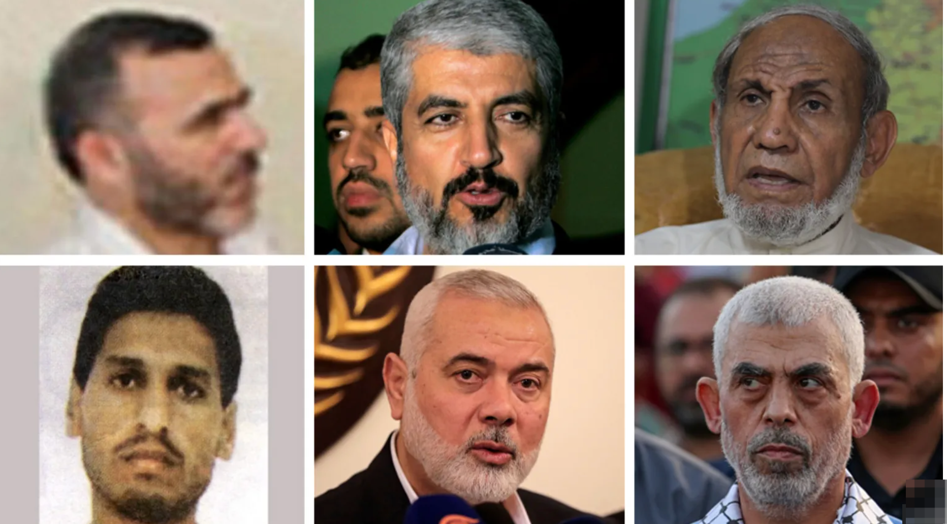 ▲哈马斯卡桑旅副首领马尔万·伊萨(左上角)、前哈马斯政治局主席哈立德·梅沙尔(第一排中)、哈马斯创始人之一马哈茂德·扎哈尔(右上角)、哈马斯军事部门首领穆罕默德·戴夫(左下角)、哈马斯领导人伊斯梅尔·哈尼亚(第二排中)和辛瓦尔(右下角)