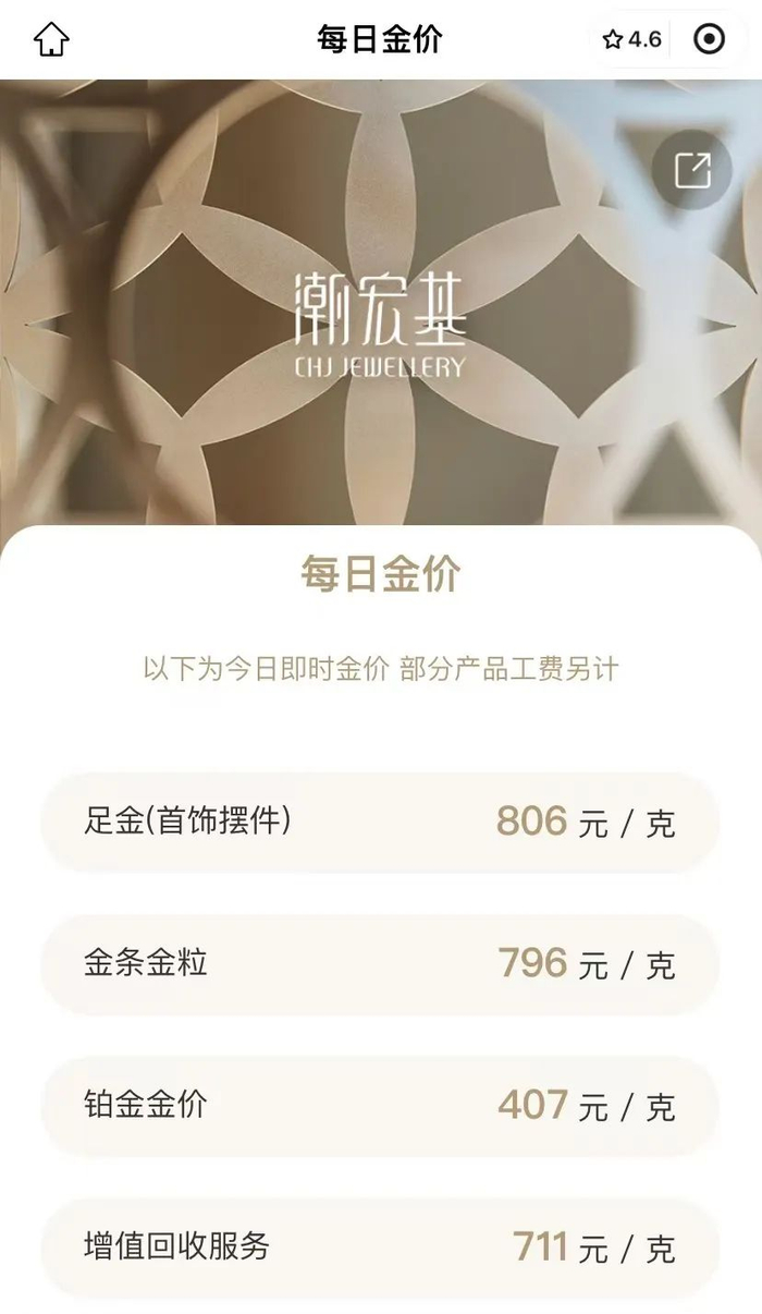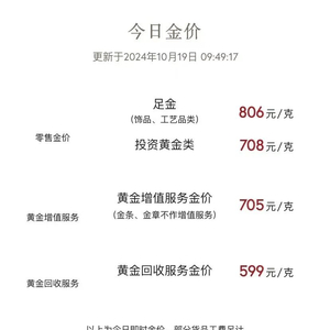 10月19日,多家品牌金饰价格突破800元/克。其中,周大福、潮宏基、六福珠宝的足金饰品价格达806元/克。