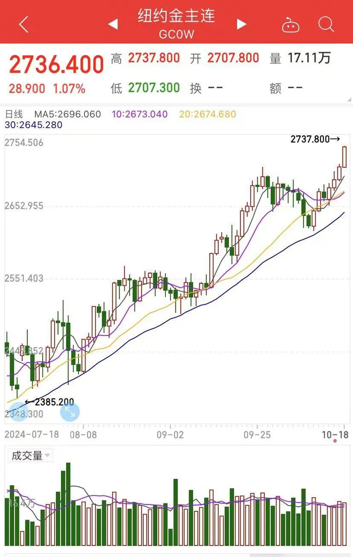 国际金价方面,美国大选的不确定性因素、宽松的货币政策以及中东紧张局势都加剧了投资者的避险情绪,国际金价周五延续涨势,纽交所12月黄金期价当天上涨0.83%,收盘再次突破每盎司2700美元关口,报2730.00美元/盎司,再创收盘历史新高。