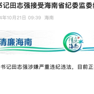 据清廉海南10月21日消息,海南省琼海市委书记田志强涉嫌严重违纪违法,目前正接受海南省纪委监委纪律审查和监察调查。