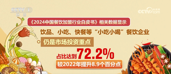 《2024中国餐饮加盟行业白皮书》相关数据显示,饮品、小吃、快餐等“小吃小喝”餐饮企业仍是市场投资重点,占比达到72.2%,较2022年提升8.9个百分点。而餐饮协会的数据则显示,2024年上半年,国内餐饮业注册量达到了131.66万家。