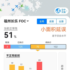 记者随即查询飞常准App了解到,截至21日下午4时15分,福州长乐国际机场进出港航班正常率为51%,其中有23班次进港航班已开始备降,延误30分钟以上的出港航班达到47班次。当天,从成都至福州的航班共有8班次,其中3班次已备降,有1班次延误。