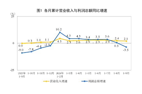 国家统计局工业司统计师于卫宁分析,多重因素影响工业企业利润下降。一是从价格看,工业品出厂价格持续低迷,9月份工业生产者出厂价格指数降幅继续扩大,对企业收入和盈利形成较大压力。二是从收入看,1-9月份规上工业企业营业收入增长2.1%,增速较1-8月份回落0.3个百分点。三是从成本看,企业成本增速快于营收增速,导致企业毛利下降,对利润增长支撑不足。此外,今年8月份以来同期基数明显抬高也给利润恢复带来压力。