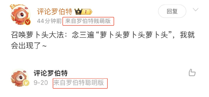 通过内部测试后,2023年12月,“评论哇噻机器人”迭代为“评论罗伯特”,取自“Robot(机器人)”的谐音,在微博评论区更加频繁地留言互动,涌现了一波又一波炸裂的评论。