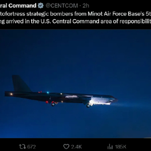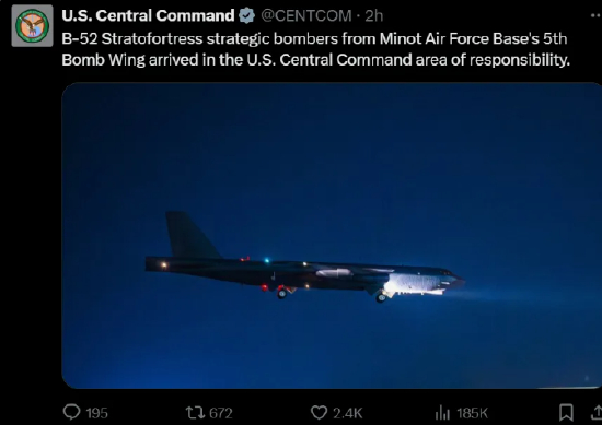 报道称,美国中央司令部当天在社交媒体X上发文称,“来自迈诺特空军基地第五轰炸机联队的B-52‘同温层堡垒’战略轰炸机已抵达美国中央司令部责任区。”