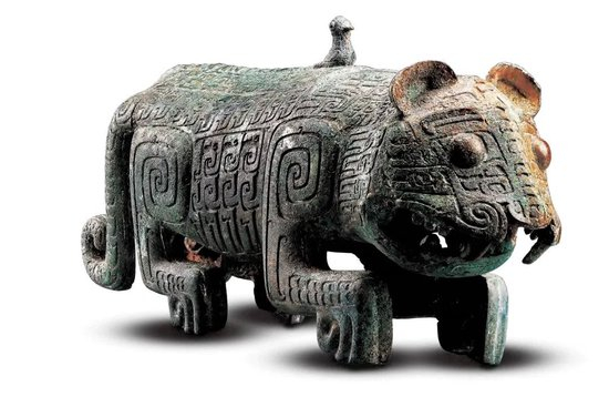商代伏鸟双尾青铜虎,为单体卧虎,重达6.2公斤,为目前存世最大的先秦青铜虎。在造型上,张口咧齿,獠牙外露,凸目狰狞,四足卧伏作欲纵之状。背栖小鸟,尖喙圆睛,惬意安详。虎鸟和平相处,极具特色。这件江西省博物馆的“镇馆之宝”虎形体大,造型奇特,形象生动,兼具勇猛霸气与伏鸟柔情,将虎的神性和人对虎的崇尚之情表现到极致,具有强烈的地域特色。