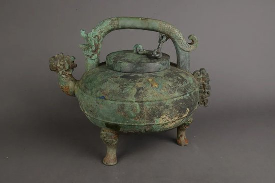 双兽首三轮青铜盘是盥洗用的水器,聪明的工匠在盘的矮圈安装三个可以转动的轮子,前轮两侧各有一由底向上伸出的兽首,回首折向盘内,成为独具匠心的旷世之作。南京博物院收藏的战国错金银镶嵌丝网套铜壶也是青铜重器,此壶又名“陈璋圆壶”,1982年出土于盱眙南窑庄。陈璋圆壶是一名齐国将军伐燕获得的战利品,用两条蟠龙交叉形成透空的青铜器纹饰,表面错金银纹饰极为华丽,结构非常复杂,与曾侯乙盘尊有异曲同工之妙,可谓先秦透空蟠龙纹青铜器的巅峰之作。