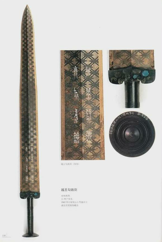 此剑1965年出土于湖北江陵望山1号墓,墓主可能是战国中期的楚国贵族悼固。越王勾践剑的剑首向外翻卷作圆箍形,内铸有极其精细的11道同心圆,剑格正面用蓝色琉璃、背面用绿松石镶嵌成美丽的纹饰,剑身满饰黑色菱形几何花纹。在剑身近格处有两行八字的鸟篆铭文:“越王鸠浅自作用剑”。“鸠浅”即“勾践”,说明它是越王勾践的自用青铜剑,虽深埋于地下2400多年,出鞘时剑身仍寒光闪闪,毫无锈蚀。