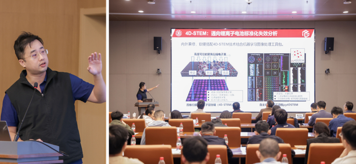 谢宇俊博士分享了AI与电池的交叉研究,作了题为《人工智能用于4D-STEM解释锂电池界面信息》的工作介绍,利用人工智能冷冻四维扫描透射电子显微镜技术Cryo-4D-STEM及其在解析锂电池电解液中的应用。利用焦耳加热和液氮冷却将电解液温度稳定在-30°C以模拟低温工况条件,通过结合人工智能图像处理方法用于高通量采集的衍射光斑分析,解析电解液中非晶态相分离以及短中程有序骨架情况。