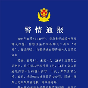 针对网传“女子试岗第一天称遭‘陪睡’暗示”信息,警方高度重视,已第一时间介入调查,后续将依据调查结果依法处理。
