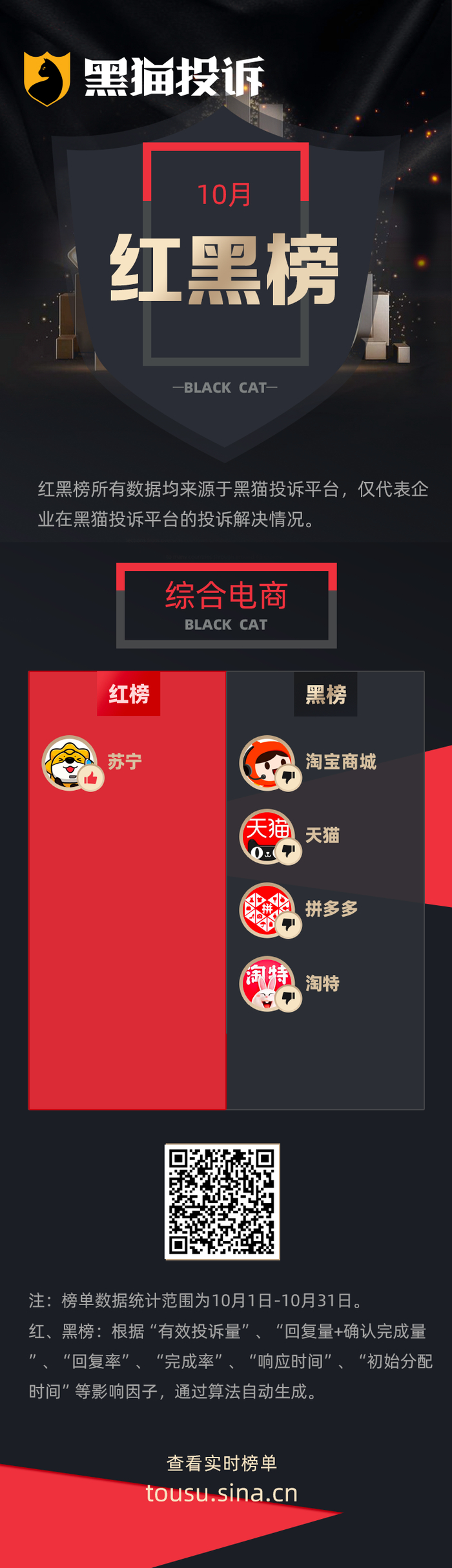 黑猫投诉发布10月企业投诉处理红黑榜单,数据均来源于黑猫投诉平台,反映了企业在黑猫投诉平台的投诉处理解决情况。