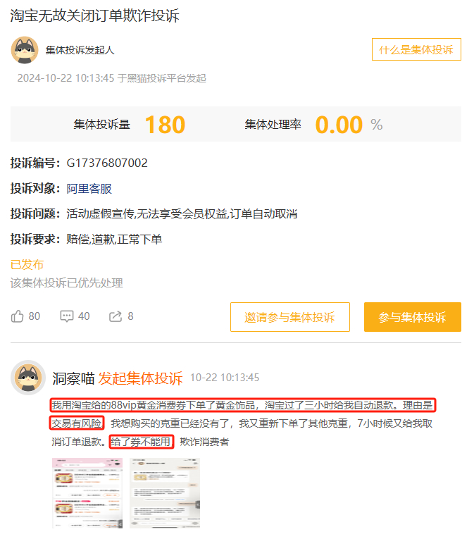 本月,各大电商平台陆续开启双十一活动。在淘宝商城,有大量消费者反映使用88vip黄金消费券下单后,订单被平台自动取消了,理由是交易有风险,而且重新下单后仍被取消。目前该问题已形成集体投诉,参与人数达180人,淘宝暂未作出任何回复。