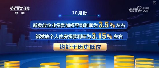 人民银行的统计显示,10月份,新发放企业贷款加权平均利率为3.5%左右,新发放个人住房贷款利率为3.15%左右,均处于历史低位。