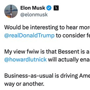 知情人士向美国彭博社透露,在马斯克发帖后,贝森特团队当晚马上为两人安排了一次通话。截至11月18日,贝森特和马斯克均没有回应。