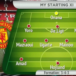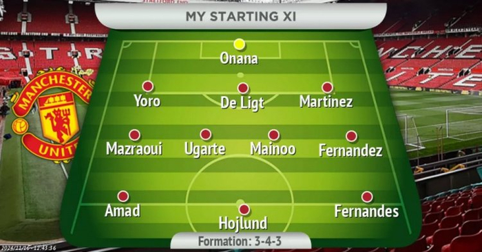 曼联一月后理想的阵容:奥纳纳、约罗、德里赫特、利桑德罗-马丁内斯、马兹拉维、乌加特、梅努、阿尔瓦罗-费尔南德斯、阿玛德、霍伊伦、B费