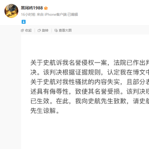 11月19日晚,曾于2023年5月公开控诉知名编剧史航涉嫌性骚扰的当事人之一小默(化名),发布微博向史航道歉,称“关于史航诉其名誉侵权一案,法院已作出判决。该判决根据证据规则,认定其在博文中关于史航对其性骚扰的内容失实,且部分表述具有侮辱性,致使其名誉受损。该判决现已生效。在此,其向史航先生致歉。”