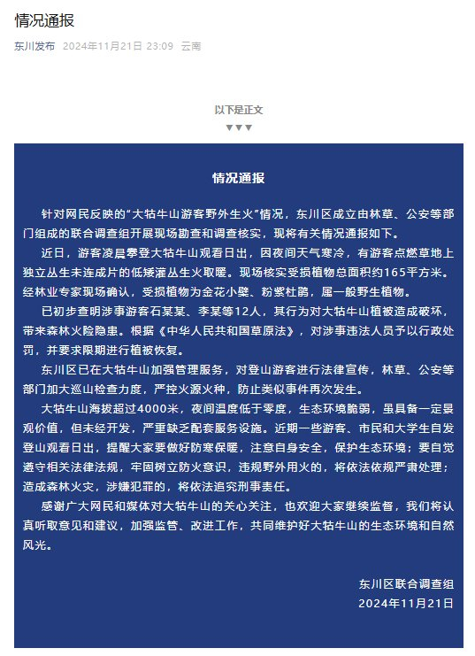 东川区已在大牯牛山加强管理服务,对登山游客进行法律宣传,林草、公安等部门加大巡山检查力度,严控火源火种,防止类似事件再次发生。