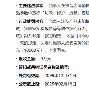 值得关注的是,今年10月,敏感肌护肤品牌泊本也因在抖音直播间发布虚假广告被罚款。行政处罚决定书显示,在今年的三场直播带货活动中,抖音“泊本官方旗舰店”的主播在推广销售商品时,存在发布的化妆品广告宣传内容与化妆品备案信息上的功效宣称不一致、广告涉及疾病治疗功能以及未表明数据出处等行为,宁波市鄞州区市场监督管理局对宁波泊本化妆品有限公司共计罚款9万元。