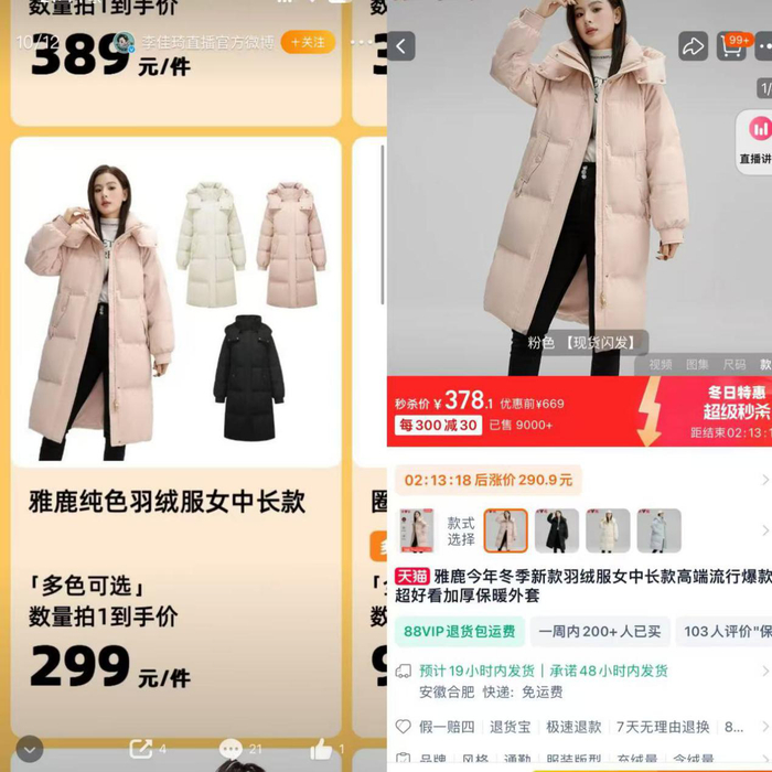雅鹿同款羽绒服价格对比,左为李佳琦7月初直播间价格,右为11月26日雅鹿天猫旗舰店价格。
