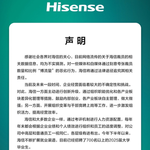 海信称,和大多数企业一样,公司通过考评机制进行人力资源配置,每年年末都会根据企业业绩和个人绩效表现进行组织和员工的适度调整,对公司中高层和普通员工一视同仁,各层级有进有出。今年下半年以来,海信不断扩展就业渠道,目前已经招聘了700名以上的2025届大学毕业生。