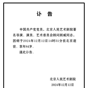 新京报讯(记者刘臻)12月12日,北京人民艺术剧院发布讣告,中国共产党党员,北京人民艺术剧院著名导演、演员、艺术委员会顾问顾威同志,因病于2024年12月12日14时31分在北京逝世。享年84岁。
