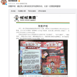 12月13日中午,旺旺集团官方账号@旺仔俱乐部发布声明称,近日,公司陆续接到消费者和客户反馈,称收到了以旺旺集团名义寄出的活动卡片快递,卡片中引导消费者“使用微信/支付宝/浏览器,或者扫描二维码领取三重豪礼”,待扫码后填写联系方式等相关信息。