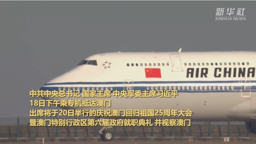 新华社快讯:中共中央总书记、国家主席、中央军委主席习近平18日下午乘专机抵达澳门,出席将于20日举行的庆祝澳门回归祖国25周年大会暨澳门特别行政区第六届政府就职典礼,并视察澳门。