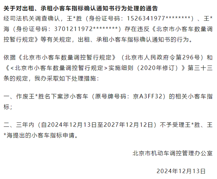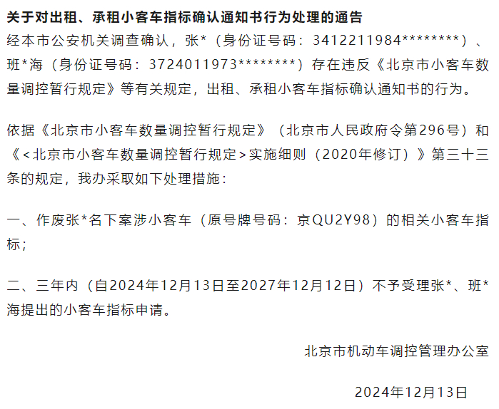 违规出租、承租,北京2个小客车指标被通告作废