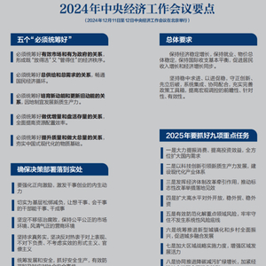对于2025年的工作,会议指出,要更好统筹发展和安全,实施更加积极有为的宏观政策,扩大国内需求,推动科技创新和产业创新融合发展,稳住楼市股市,防范化解重点领域风险和外部冲击,稳定预期、激发活力,推动经济持续回升向好,不断提高人民生活水平,保持社会和谐稳定,高质量完成“十四五”规划目标任务,为实现“十五五”良好开局打牢基础。