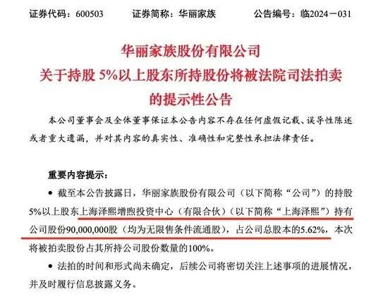 华丽家族(600503)公告称,公司于近日收到青岛中院发来的《执行裁定书》,青岛中院将拍卖公司持股5%以上股东上海泽熙增煦投资中心所持有的公司9000万股股票,占其所持华丽家族持股的100%,占公司总股本的5.62%。