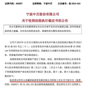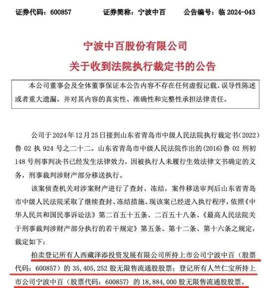 公告显示,该案侦查机关对涉案财产进行了查封、冻结,案件移送审判后山东省青岛市中级人民法院采取了继续查封、冻结措施。现该案已经进入执行程序,依照相关法律规定,拍卖登记所有人西藏泽添投资发展有限公司所持上市公司宁波中百的3540.53万股无限售流通股股票;登记所有人竺仁宝所持上市公司宁波中百的1888.4万股无限售流通股股票。