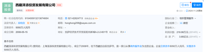 天眼查显示,西藏泽添投资发展有限公司 (曾用名:上海泽添投资发展有限公司) ,成立于2008年,企业注册资本5050万人民币,法定代表人为徐柏良,目前为已吊销状态。