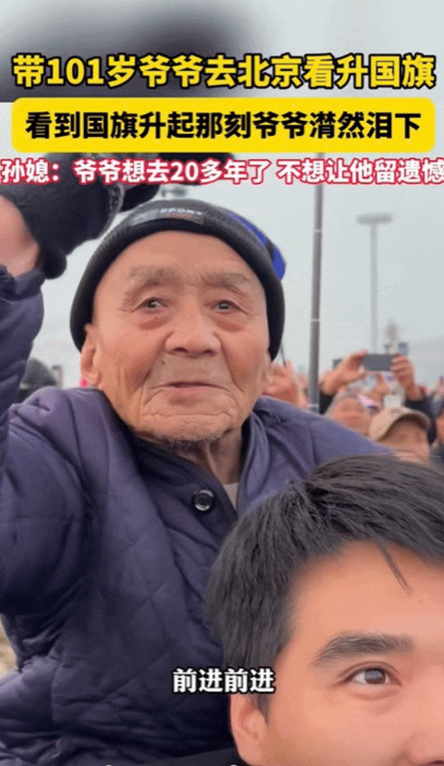 “爷爷说想去北京20多年了,不想给他留遗憾。”一小伙和媳妇带101岁爷爷来北京看升国旗,完成爷爷的梦想。天安门前,当国歌奏响,国旗升起,爷爷在敬礼的瞬间潸然泪下,网友们也瞬间破防。