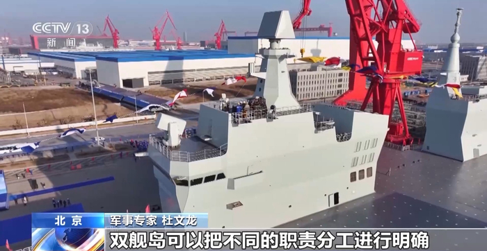 军事专家 杜文龙:有了两栖攻击舰,特别是以076、075为主的这种作战编队,我们的登陆方式将围绕立体登陆。之前都是通过坦克,包括其它渡海装备向滩头冲击,现在可以把直升机、无人机、新型固定翼舰载机一并在甲板上起飞,对目标进行高精度打击。所以从登陆的方式来看,从平面到立体是重要变化也是一个重要转折。