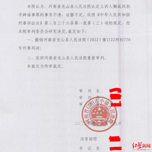 日前,红星新闻记者从懈成凤家属及辩护律师张涛处获悉,2024年12月19日,信阳市中级人民法院做出刑事裁定书,撤销了原审判决,将该案发回重审。2024年12月31日,家属接到光山县人民法院电话,称法院已经准许检察院撤诉。