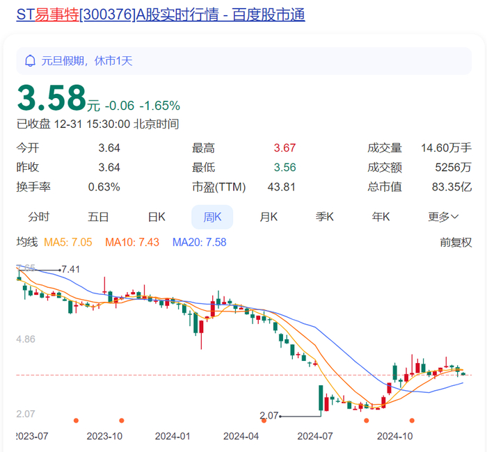 2024年,ST易事股价经历暴跌暴涨,从开年的6元多一路跌至7月最低的2元出头,随后又急速拉升,从9月27日起,3个交易日内涨幅超过56%。