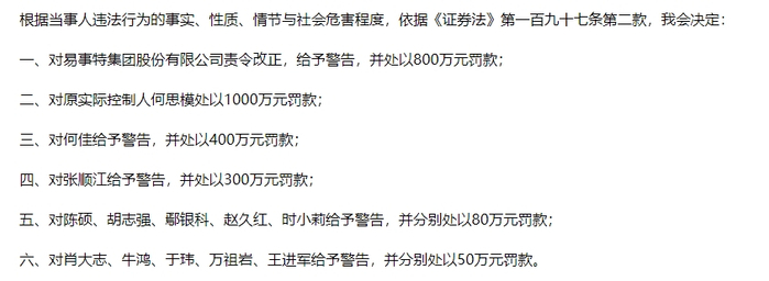 记者注意到,包括陈硕在内的多名当事人提出陈述、申辩意见并要求听证,但申辩意见最终未被中国证监会采纳。最终,ST易事特被责令改正,给予警告,并处以800万元罚款;原实际控制人何思模被处以1000万元罚款。此外,中国证监会还对何佳给予警告,并处以400万元罚款;对张顺江给予警告,并处以300万元罚款;对陈硕、胡志强、鄢银科、赵久红、时小莉给予警告,并分别处以80万元罚款,其余当事人也被给予警告,并分别处以50万元罚款。