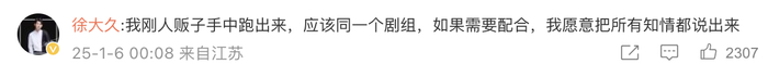 演员徐大久也在嘉嘉文章下留言称,自己也曾经历类似事件,然而自己到了曼谷机场之后就意识到不对劲,没有上车,收了对方剧组1200元定金就离开了,并且在机场录制了视频发出提醒,“很多演员会收到来泰国拍摄短剧的邀约,在要求你发送演员资料后,他们会给订酒店机票。下飞机后,有自称‘剧组工作人员’的人会收取护照,称带你优先出海关。上车后会开车到300公里外接近缅甸边境的地方——湄索。”