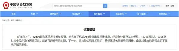 1月8日,中国铁路12306网站发布情况说明称,当天上午,12306票务系统发生繁忙预警,旅客在手机端App登录出现拥堵情况,经紧急处置已基本缓解。12306网站和12306支付宝小程序始终运行正常,旅客可通畅登录购票。下一步,将持续加强技术维护,确保系统各渠道登录通畅。由此对旅客购票带来的不便表示诚挚歉意。