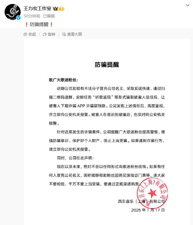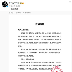 1月17日,歌手王力宏工作室发布防骗提醒,称近期有不法分子冒充公司名义,采取发送快递、通过扫二维码进群、安排任务“听歌返现”等形式骗取被害人信任,诱导被害人下载诈骗APP并骗取钱款,公司已向公安机关报警。