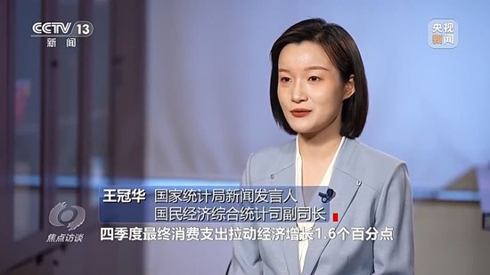 国家统计局新闻发言人、国民经济综合统计司副司长 王冠华:四季度最终消费支出拉动经济增长1.6个百分点,比上个季度提高了0.2个百分点。以冰雪经济、首发经济为代表的消费新场景热度上升,直播带货、即时零售等消费新业态快速发展,还有一些国货潮品,出海又出圈。这些变化增强了对消费市场恢复的信心,同时这些新的趋势也是未来进一步扩大国内需求的重要政策着力点。