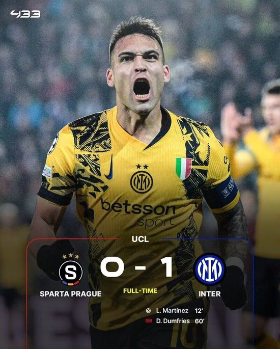 国米客场1-0小胜布拉格斯巴达,末轮不败就直通16强。巴斯托尼助攻劳塔罗首开纪录,邓弗里斯打进一球,但是被判越位在先。