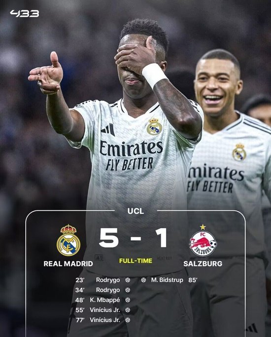皇马主场5-1大胜萨尔茨堡红牛。贝林厄姆两次助攻罗德里戈双响建功,门将送礼姆巴佩再下一城,维尼修斯内切爆射收获皇马生涯百球+双响,比斯特鲁普扳回一球。