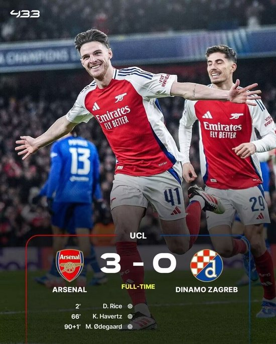 阿森纳主场3-0轻取萨格勒布迪纳摩,末轮不败就直通16强。赖斯开场2分钟闪击,哈弗茨传射建功,厄德高补时锦上添花。