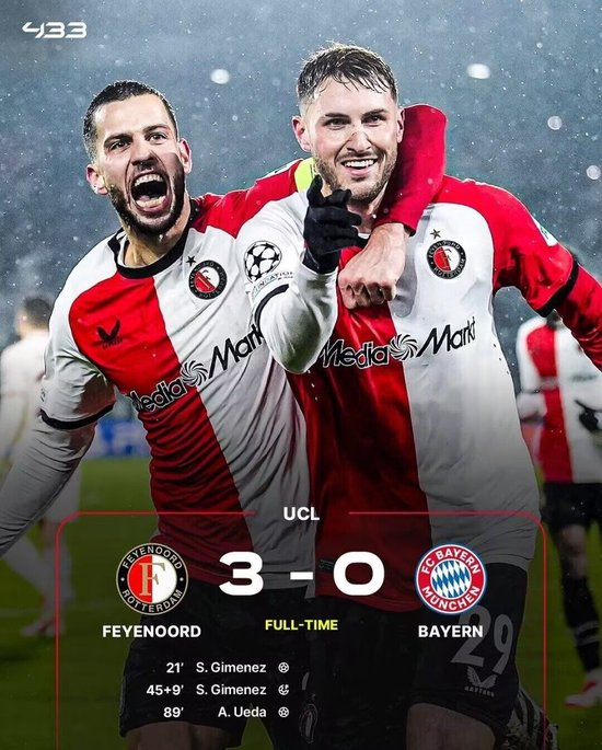 拜仁客场0-3惨败费耶诺德。金玟哉解围失误,圣地亚哥-希门尼斯破门,阿方索-戴维斯伤退,格雷罗送点,圣地亚哥-希门尼斯点射梅开二度,萨内中柱,上田绮世反击破门。