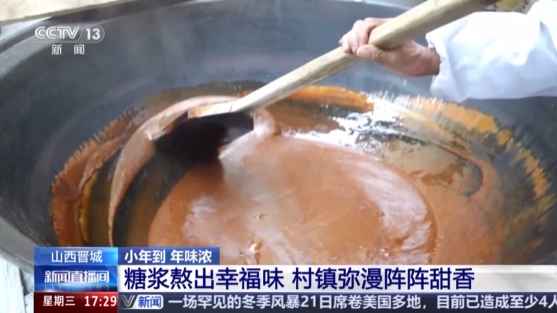 走进山西晋城泽州县周村镇,手艺人介小刚的工坊里,弥漫着阵阵香甜气息,大伙儿正忙碌着制作具有当地特色的糖瓜,为小年增添浓郁的节日氛围。
