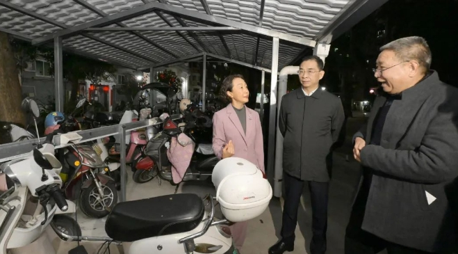 随后,郭宁宁、吴贤德来到金山明星小区,实地检查电动自行车集中充电区域安全管理、消防设施配备等情况,就车辆有序停放、规范管理、优化充电设施布局等提出指导意见。