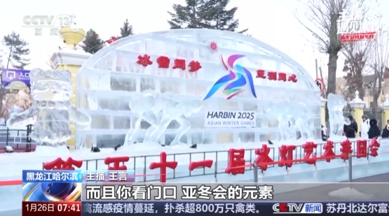 主播 王言:兆麟公园正在举办第51届冰灯艺术游园会。亚冬会的元素,现在真是在哈尔滨的大街小巷随处可见。