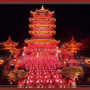 黄鹤楼坐落在武汉市武昌区蛇山之巅,是中国历史文化名楼之一,被誉为“天下江山第一楼”。经过几十年的兴建,黄鹤楼及附属景点区域渐次扩展,形成了一个逶迤2000余米,覆盖整个蛇山,拥有各类景观96处,占地面积达40.3公顷的大型综合性景区。春晚舞台,用高科技光影技术让千年名楼“炫”起来,新搭建的舞台宛若波涛涌动的星河,与主楼大红主调的光影交相辉映、熠熠闪耀。
